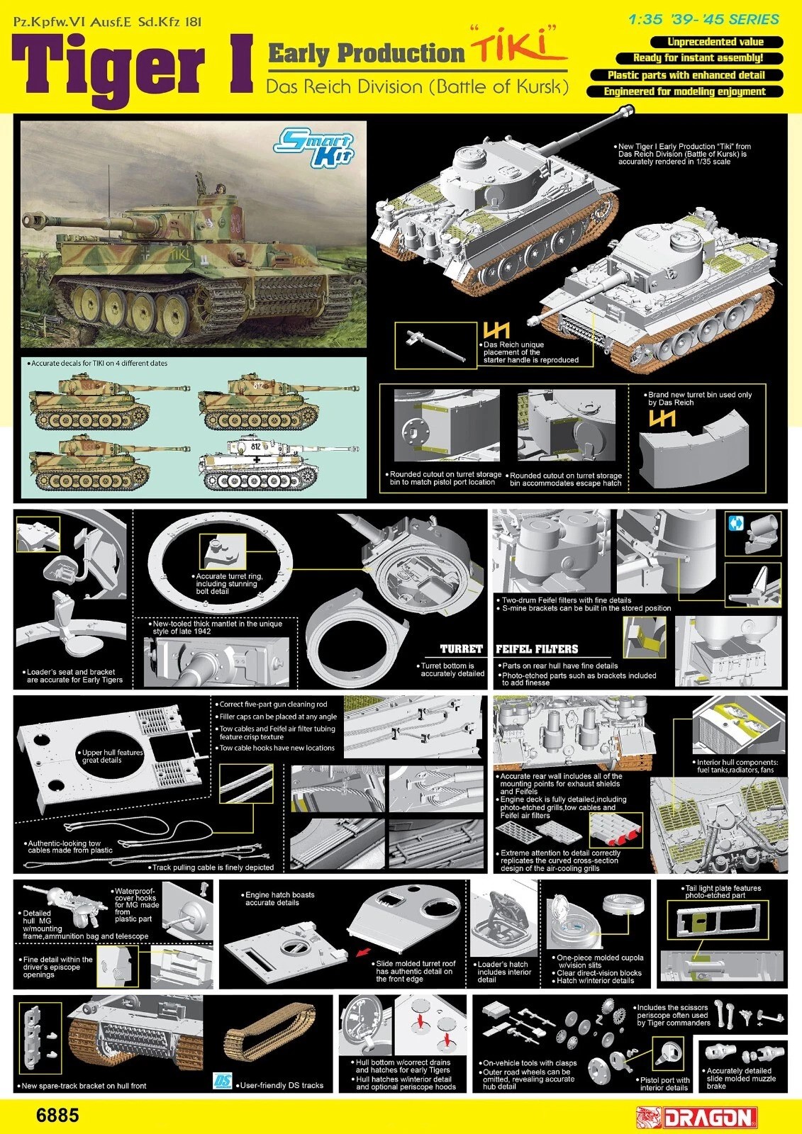 Wehrmacht-HEER Henschel Sd.Kfz.181 TIGER Pz.Kpfw.VI Tiger I Ausf.E “Early production “TIKI” Das Reich division – Battle of Kursk” Heavy tank – Dragon smart kit